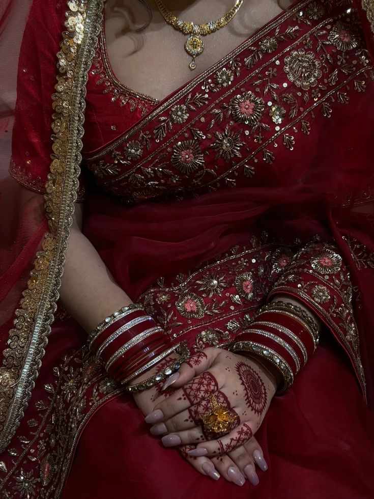 Her red bridal lehenga shimmered under the golden lights. Heavy jewelry adorned her neck and ears, and the delicate red veil rested gracefully over her head.
